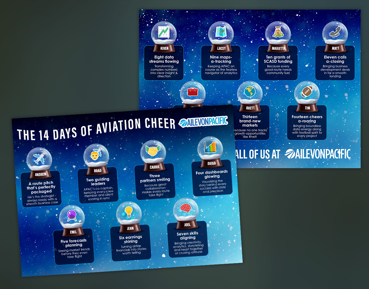This year, my client Ailevon Pacific (APAC) asked me to create a custom holiday greeting design for their annual end-of-year message. The concept was inspired by The Twelve Days of Christmas, reimagined as “The Fourteen Days of Aviation Cheer.” Each “day” represented one of APAC’s fourteen employees, turning the greeting into a warm, personal celebration of the entire team.