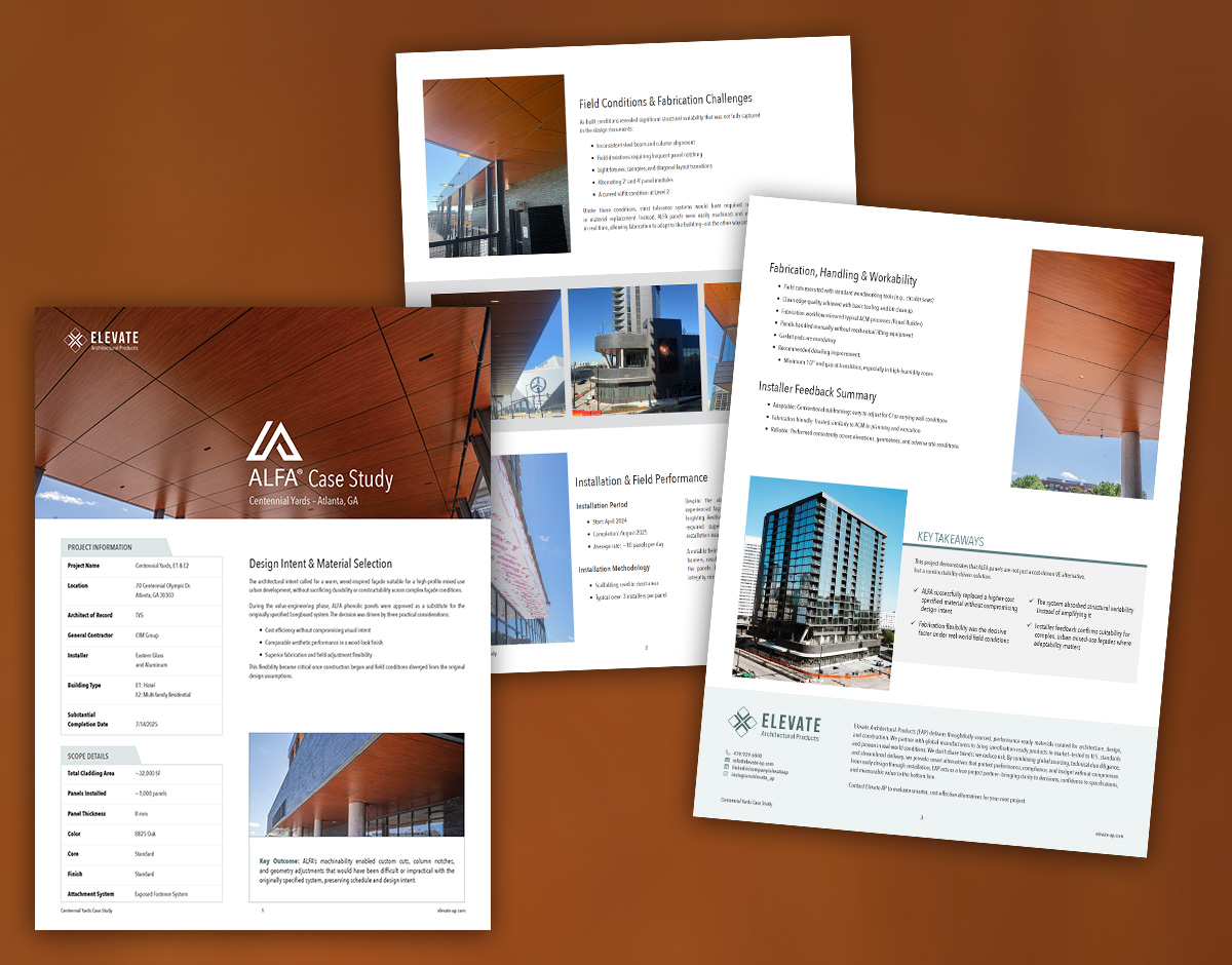 From the start, we grounded the case study in Elevate’s existing brand colors and standards, ensuring consistency with their broader identity. The featured product, a wood paneling facade that gives any building a striking, distinctive exterior, brought its own visual personality to the project. We leaned into the rich, warm tones of the paneling itself, weaving that iconic color throughout the layout to create a cohesive, immersive presentation.
