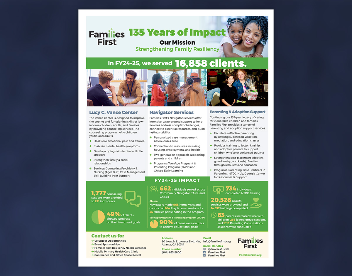 Every year, Families First (familiesfirst.org) produces an All Agency Flyer, a one-page overview designed to highlight the organization’s three core areas of focus and the impact they’ve made in each. This year, I partnered with their team to redesign the flyer with a strong emphasis on graphic design for nonprofits, ensuring the information was clear, engaging, and easy to understand at a glance.