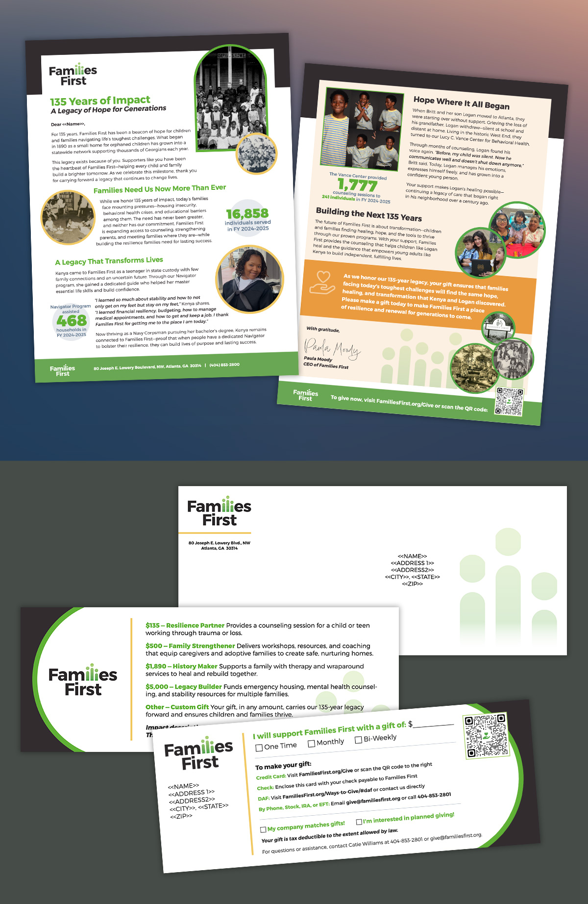 My goal was to use thoughtful graphic design to visually unify the materials while highlighting the impact of Families First’s work. The CEO letter shares powerful stories from the year as well as the organization’s 135-year legacy of serving Georgia families. The giving card outlines donation levels and clearly shows what each contribution can make possible. On the back of the card, I designed an easy-to-complete form along with a QR code for quick online giving.