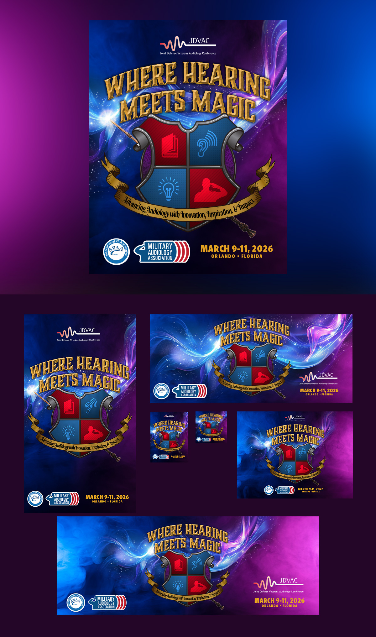 This year marks my thirteenth year designing the graphics for JDVAC, the Joint Defense Veterans Audiology Conference—and lucky number 13 is taking us to Orlando, right near Universal Studios! To celebrate the location, the conference team wanted a magical theme inspired by the world of Harry Potter. While we couldn’t use any copyrighted imagery, we developed our own creative concept that blended a sense of wonder and enchantment with the professionalism and purpose of the conference.