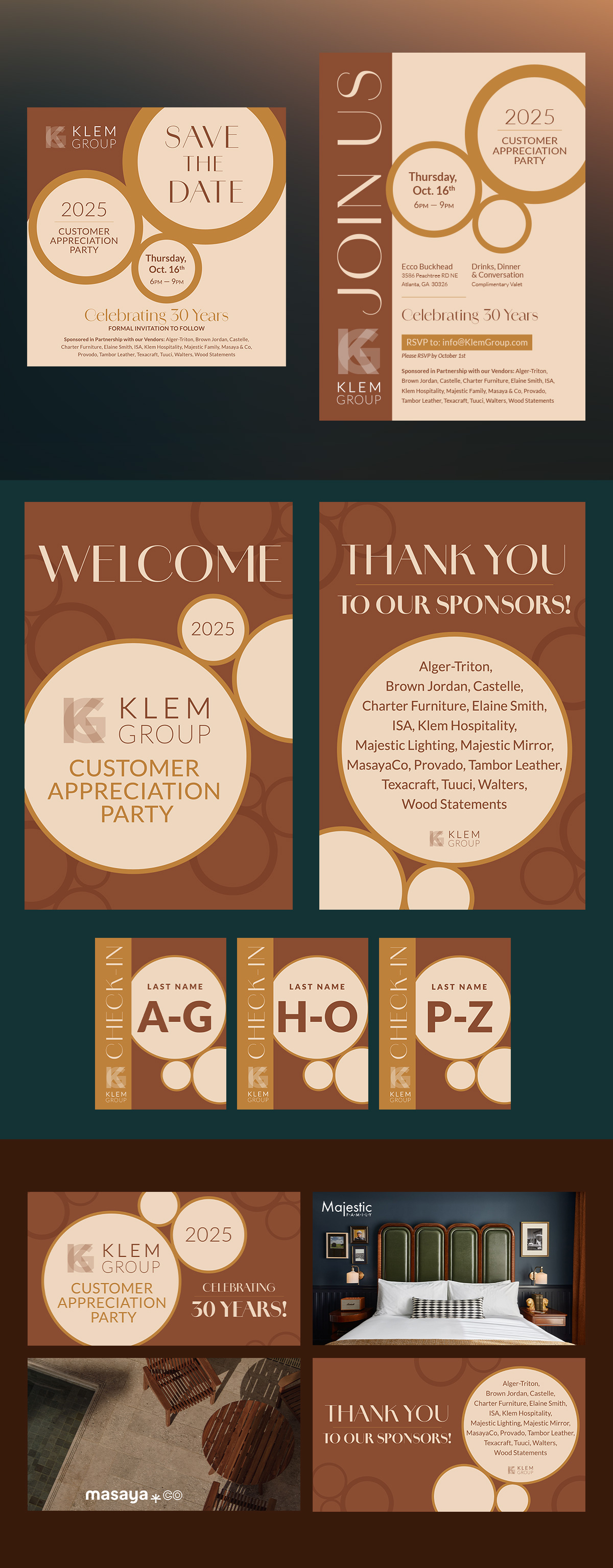 Klem Group (klemgroup.com), a premier representative of high-end interior and exterior furniture brands for hospitality and commercial projects, hosts an annual customer appreciation event to celebrate their clients and partners. This year, they wanted to elevate the look and feel of the celebration and asked me to create cohesive, high-impact graphic design for events that reflected both their brand and the venue’s sophisticated atmosphere.