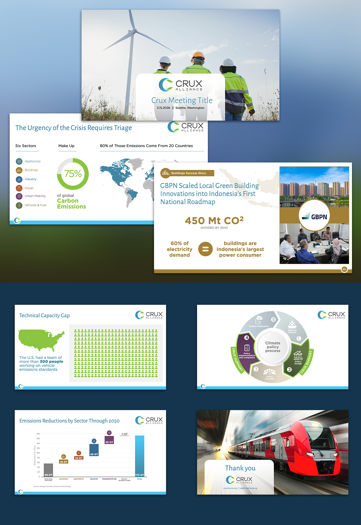 Crux Alliance is dedicated to supporting the rapid implementation of cutting-edge climate policies, and this was a high-stakes opportunity to communicate their impact on a global scale. The challenge was clear: they had a wealth of powerful information to share, but it needed presentation design that could make complex ideas feel accessible, compelling, and visually engaging.
